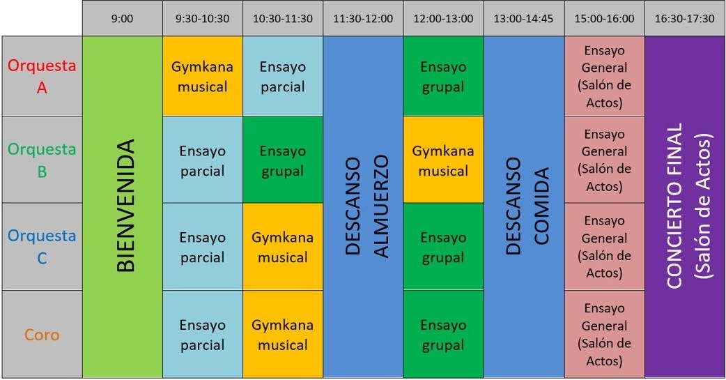 El encuentro MUSIKIDS consiste en: gymkana musical, ensayos parciales por instrumentos, ensayos grupales, ensayo general y concierto final.