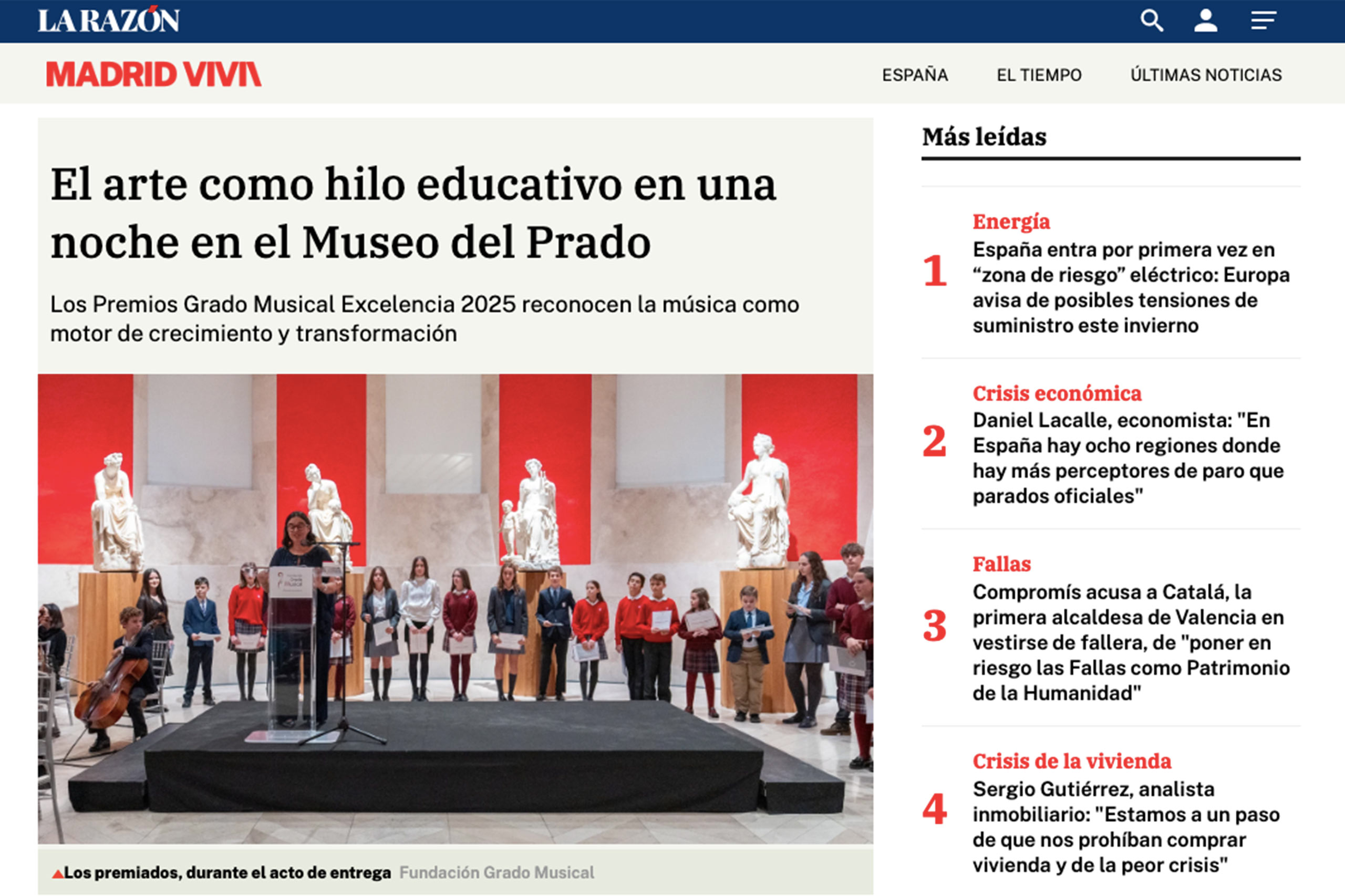 Muy agradecidos por el artículo en La Razón sobre la II Edición de los Premios Grado Musical Excelencia: "La ceremonia de los Premios Grado Musical Excelencia 2025. Un espacio idóneo para reforzar la idea central del certamen: que la educación musical de calidad desarrolla competencias técnicas y, además, ensancha la percepción, orienta la sensibilidad y fortalece la comprensión del mundo interior" Leer la noticia completa.